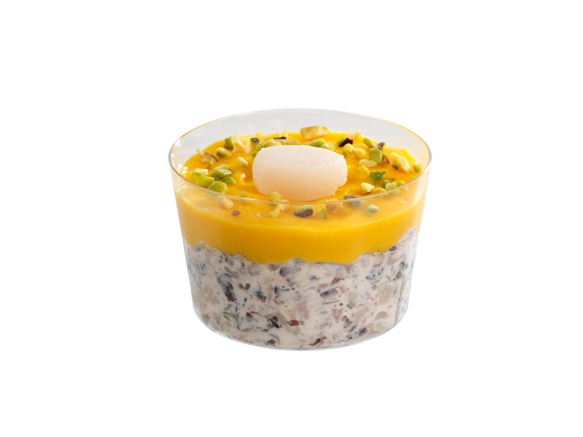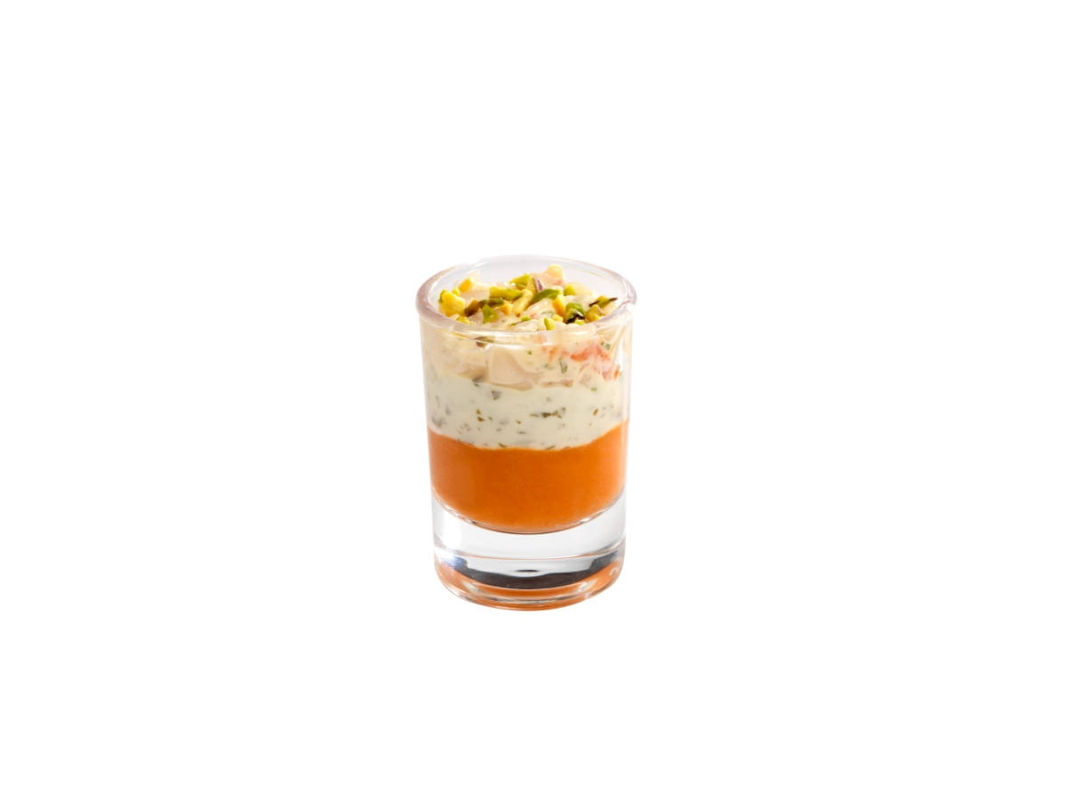 Verrine Saint-Jacques, crème de tomate et crème aux fines herbes