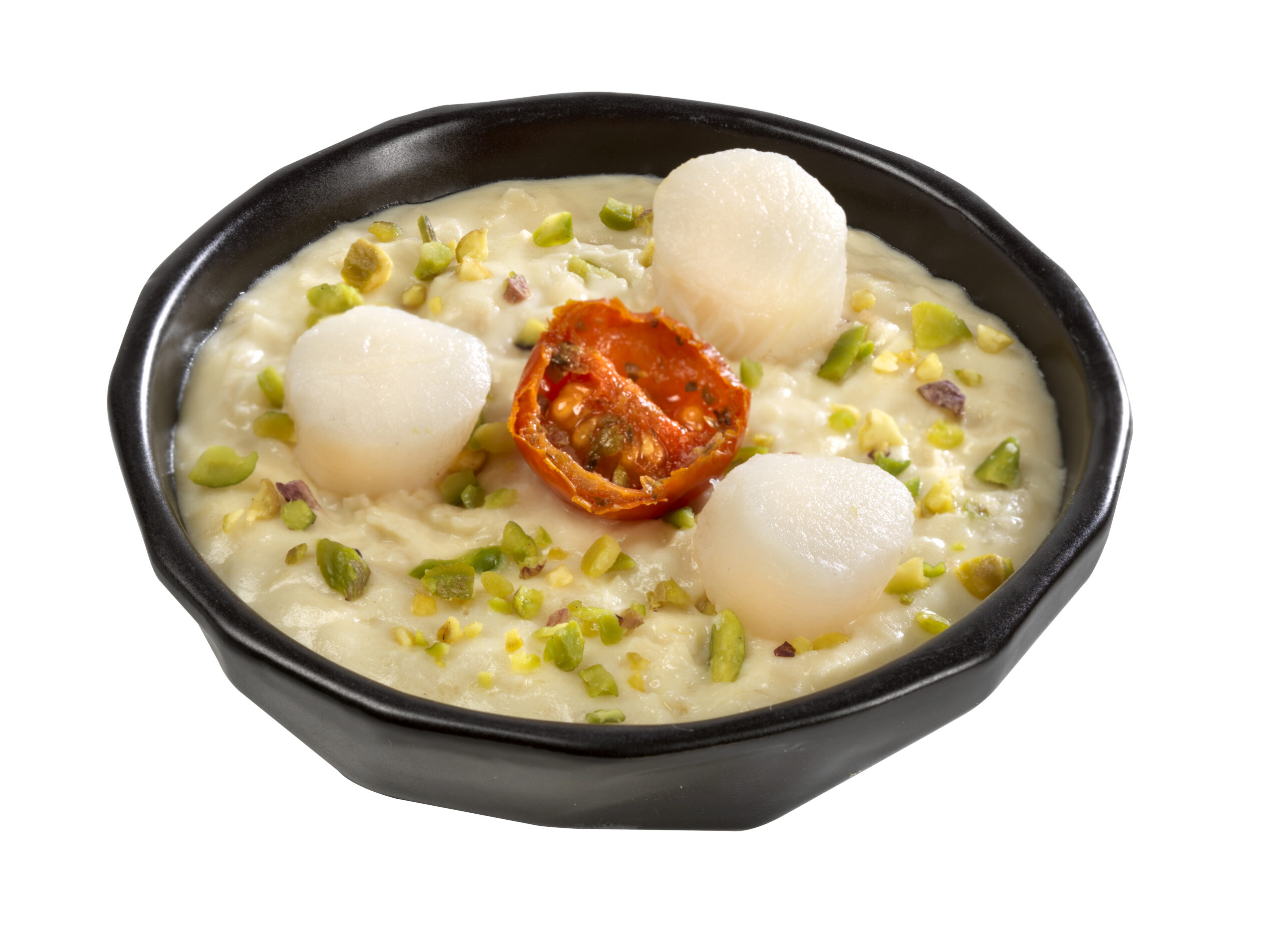 farine de ble, escalope de foie gras de canard, beurre, filet de caille, creme, shiitaké, brisures de morilles, échalote, vin jaune, fond de volaille, tomate cerise marinée, huile d'olive, trompette de la mort, épices